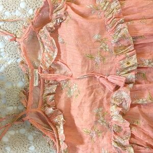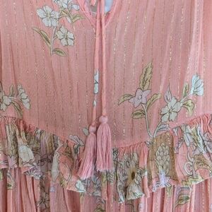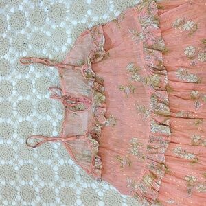Reposhing this item I purchased from @pretty__monster. Loved it, but ready to rotate for something new. Unfortunately this dress was just too big on me:( so, I'm passing it on to you! The fabric is a very lightweight cotton in candy pink colour, gold thread throughout. Adjustable straps, ruffles at the waist and dress top, stings to tie in the front. I presume the lining on this dress was removed. There are remnants of the fabric left around the top of the dress as though it were pulled out with some loose threads. But the actual dress is in perfect condition. This could even be used as a beautiful airy beach cover up. Belt it, add cowboy boots and long jewelry or dress it up with a belt and gladiator sandals. This beautiful piece is awaiting your next summer vacation.