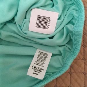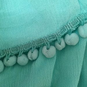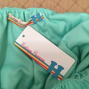 A darling bandeau top from Vintage Havana with a fun Pom Pom trim. Size large, new with tags. Pretty Aqua color. 14" armpit to armpit (unstretched) and 13" seam to seam at bottom (unstretched.) Stretchy elastic at top and bottom. 11" Top to bottom. Super cute.