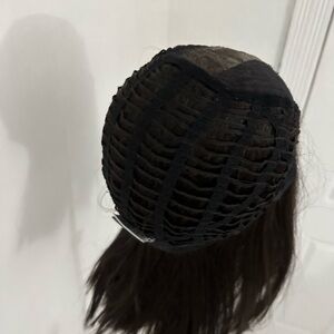 This sleek black wig features a smooth texture and a center part, offering a natural look with subtle layering for added movement. The medium-thickness strands fall gracefully to shoulder length, providing a sophisticated and versatile style. Perfect for enhancing your appearance with a touch of elegance. Used with lots of life left.