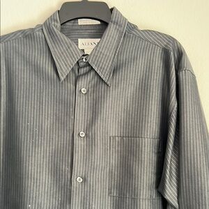 Elegant gray striped shirt by Alfani. Features button-up design and chest pocket. Soft slick fabric and gently used.