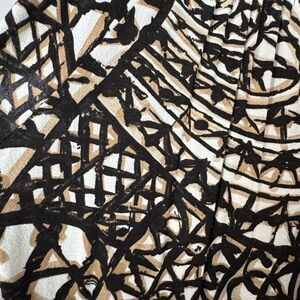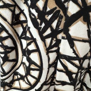 It's a viscose/elasthane blend. Fully lined. The hips run small, but there's a lot of stretch to the fabric. The print is black, white, and tan geometric pattern.