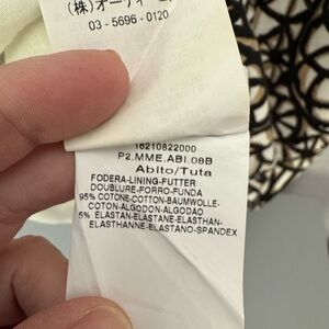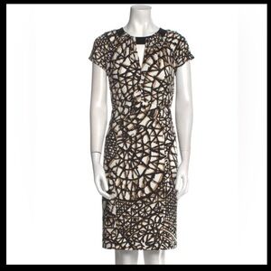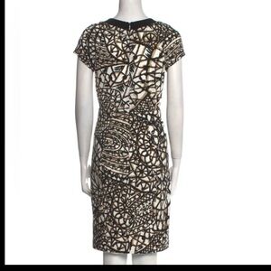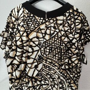 This sophisticated MaxMara dress features a striking black and white pattern, perfect for work or cocktail occasions. The sleeveless sheath design is complemented by a flutter sleeve and a classic crew neck, offering a refined and timeless appeal. Its midi length and structured fabric ensure a polished and elegant look.
