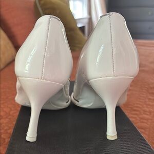 Jil Sanders white patent heels, crafted with a sleek pointed-toe design. These minimalist shoes are perfect for adding a touch of sophistication to any formal occasion. Made from high-quality materials, they offer a refined and polished look.