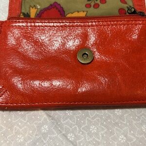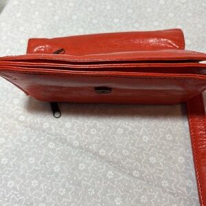 This is a gently used leather wristlet. The leather is nice and supple and in good shape, all zippers and snap function properly. The metal is a bronze and the button on front has some rubbing wear on it (see pictures) and there are three very small dot marks on leather under flap (see pictures) and small white mark on lining of the flap (see pictures). These do not detract from the style of the item.