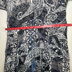 Chic dress with a blue, gray and white paisley pattern. Features a unique design with cut-out shoulders. It also features a cut out in the back, a v-neck, pockets, and a tie with tassels to cinch in the waist. Dress is considered a mini but isn’t too short so that’s great for when you don’t want to show too much leg.