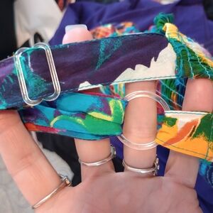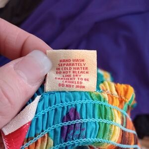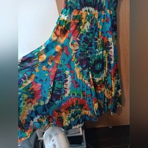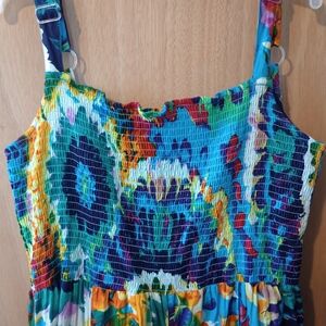 Vibrant and colorful tie dye dress. The part of the dress is stretchy and the straps are adjustable. it is a large, but I wear a 2X and it fit me great because of the stretchy area. if you are a little thicker than an xl in the bottom, then it may be a little uncomfortable. no holes are stinks