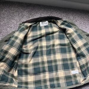 Stylish olive green jacket featuring a plaid lining. Perfect for casual wear and outdoors