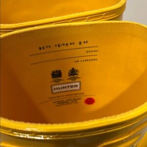 Bright yellow rain boots by Hunter. Durable and stylish. Perfect for rainy days.