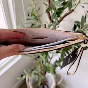 Chic and playful, this Kate Spade wristlet features a vibrant strawberry print on a cream background. Perfect for adding a touch of fun to your outfit.