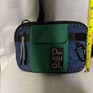 Stylish and versatile, the Desigual convertible bag features a sleek black and blue design with a vibrant green accent. Perfect for everyday use. Great for travel.