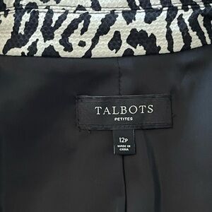 Elevate your style with this Talbots blazer, showcasing a bold black and white animal print. Its structured design with a collar and 3/4 length sleeves adds a touch of sophistication to any outfit. The blazer's sleek finish makes it a standout piece for any occasion. Spring/ summer weight.