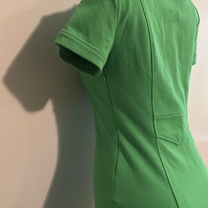 Short-sleeved dress with six-button placket, princess seams, banded hemline and cuffs, and two above-breast pockets. Stretch