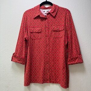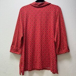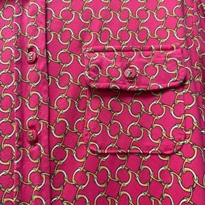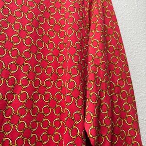 Vibrant red blouse with a striking yellow chain pattern. Features a classic collar and button-up front.