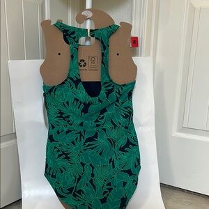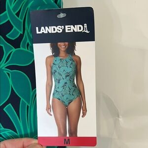 Dive into style with this Lands' End one-piece swimsuit, featuring a vibrant green hue with black abstract botanical prints. Designed for both comfort and fashion, it boasts a high neckline and a classic tank-style top, perfect for any swim occasion. The stretchy material ensures a snug fit, making it ideal for active days at the pool or beach.