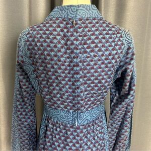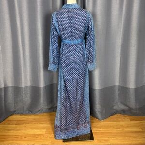Step out in style with this elegant blue and purple patterned vintage maxi dress. Perfect for any occasion, this dress offers a flattering fit and a sophisticated look.