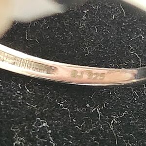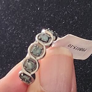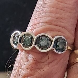 This elegant ring features stunning blue diamond gemstones set in a sleek rhodium plated silver band. Size 10.