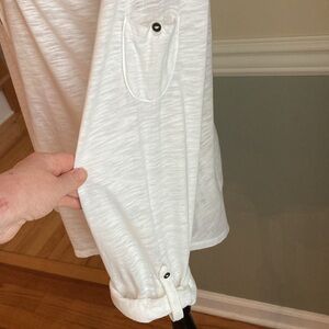 Women’s size LARGE. Elegant and versatile white long sleeve top, perfect for any occasion. Features a stylish button detail for added flair. 20” pit to pit. 27” top of shoulder to hem. Like new condition!
