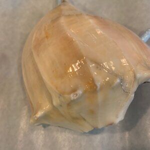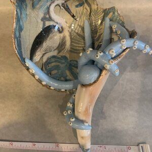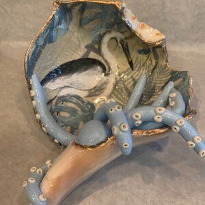 Light tan whelk adorned with a handmade blue clay octopus. Inside is decoupaged a blue & white heron and leaf design. Finished in a glossy resin and trimmed in 18k gold leaf. Sizes in photos.