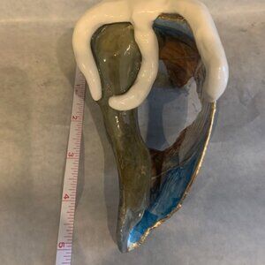 Grey whelk adorned with a handmade white clay starfish. Inside is decoupaged a boat and water scene design. Finished in a glossy resin and trimmed in 18k gold leaf. Sizes in photos.
