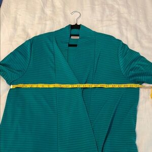 Women’s Chico’s lightweight open front cardigan. Size XL (see measurements) I had to remove the garment tag. Wash cold, tumble dry low or hang dry. Color is a darker shade of teal. Perfect for layering, stylish and comfortable. In excellent used condition. No rips stains, snags or pilling. Stored and shipped from a smoke free home. Reasonable offers welcomed or bundle with another item for a 20% discount in savings on shipping costs.