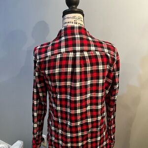 Stylish red and black plaid button-up shirt. Perfect for casual wear.