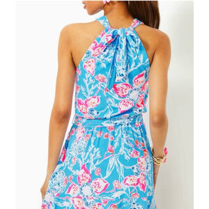 This is a Lilly Pulitzer romper It features a vibrant blue background with a pink and white floral pattern. The romper has a V-neckline and a halter tie at the neck. It includes a self-tie belt at the waist for an adjustable fit. The material is Rayon/Spandex