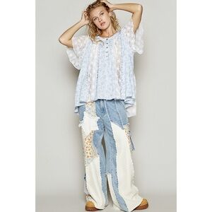 POL Blue Floral Lace Ruffled Sleeve Top with Pearls
