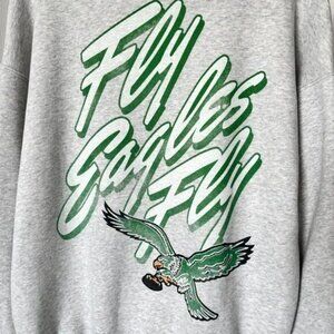 Comfortable popover hoodie with an oversized-fit silhouette. Philadelphia Eagles throwback-inspired graphic detail on chest and “Fly Eagles Fly” script graphic on back. Front pouch pocket. Banded hem and cuffs. Abercrombie’s softAF fleece fabric is soft, smooth, and plush on the inside. No longer available on A&F website. RN 75654