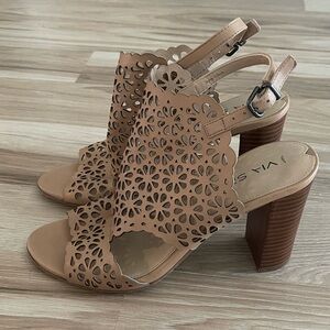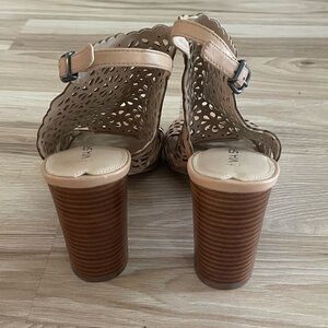 Elegant tan heeled sandals with intricate cut-out design. Adjustable ankle strap. Perfect for any occasion.