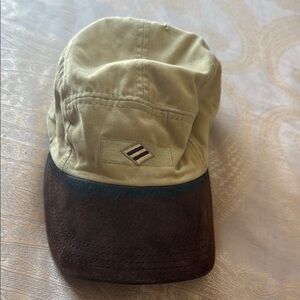 Stylish two-tone cap featuring a logo. Light green top with a dark brown brim.