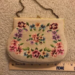 Elegant cream clutch with floral stitching. Perfect for adding a touch of vintage charm to any outfit. Green “jewels” on clasp. Clean and in good condition.