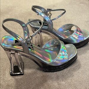 New! Step out in style with these stunning platform holographic silver sandals. Perfect for adding a touch of glamour to any outfit. Purchased for a disco party but they are too large (I’m a size 5).