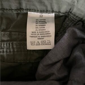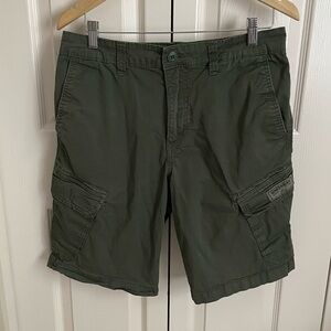 UNIONBAY Men's Green Cargo Shorts. They are made from a blend of 98% cotton and 2% spandex, offering comfort and flexibility. These shorts are suitable for casual wear and outdoor activities, with ample pocket space for carrying essentials. Worn once. Excellent condition.