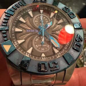 Elegant silver watch with a striking blue bezel. Perfect for any occasion.