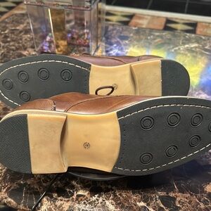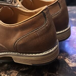 Experience timeless elegance with these jf j.ferrar Brown Leather Derby Oxfords with memory foam in a men’s size 11M. Crafted from polished leather, they feature a sleek rounded toe and open lacing for a classic look. Perfect for both business and smart casual occasions, these shoes offer a versatile and sophisticated style. In great condition with minimal signs of wear from a smoke free pet free home.