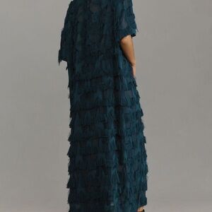 This stunning blue gown from Anthropologie features a ruffled, tiered design that adds a touch of elegance and whimsy. The dress is perfect for a wedding guest or cocktail occasion, with its flowing silhouette and short dolman sleeves. The v-neckline enhances its sophisticated appeal, making it a standout choice for any special event.