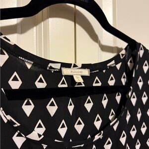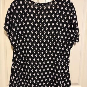 Stylish black and white geometric patterned top, perfect for any occasion. Comfortable and chic, this top is a must-have for your wardrobe.