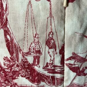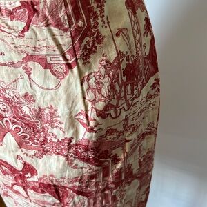 Genuine Vintage Equestrian print skirt! Beautiful and lightweight! Perfect for travel, fall, or summertime! Can easily dress up or down! Hidden left side zipper with small mother of pearl button closure. Slightly antiqued yellow/ivory color with red Parisian equestrian print’ accents. 100% linen exterior. They look like an aged yellow and maroon. Fully lined acetate interior. Dry clean only.