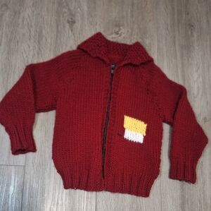 Hand Knit children's sweater size 6-7. This is Snoopy on the back and a dog house on the front. Full zipper. Armpit to armpit is 12 inches shoulder to bottom is 16 Armpit to cuff is 11 1/2. In great condition may have been worn twice.