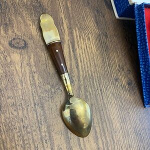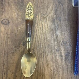 Vintage spoon set from Thailand. Comes in original box with a slot for each of the six spoons. Spoons are in good, vintage condition. Box does have writing on the inside cover, along with some general wear.