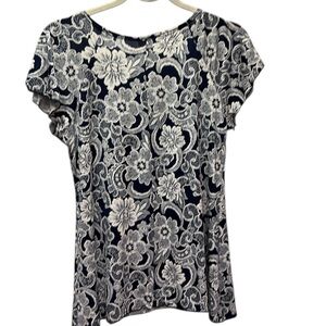 Brittany Black Womens Embossed Blue and White Floral Blouse Size Small Petite