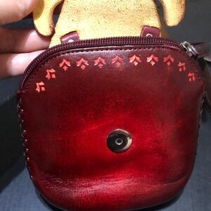 This crossbody bag showcases a whimsical bill face with large eyes, crafted in vibrant orange and brown tones. Its structured, rounded shape and sturdy leather straps make it a standout accessory for any occasion. The playful design adds a touch of fun to your everyday style. Snap and zipper closure. Handmade in Mexico.