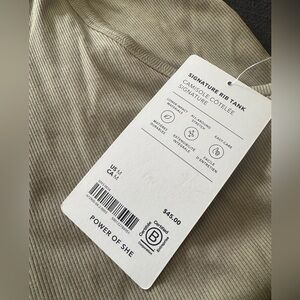 Brand new tank, never worn. Very soft but weighted rib material with some stretch. Light olive green color (cooler green than it looks in photos). Bought to match some hiking boots that I returned, and way past the return window.