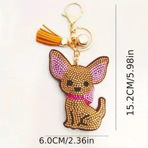 Cute Pink & Brown Chihuahua Dog Rhinestone-Encrusted Key Chain, Bag, & Car Charm with Ring Buckle Size:2.36” X 5.98” 1”=2.54cm