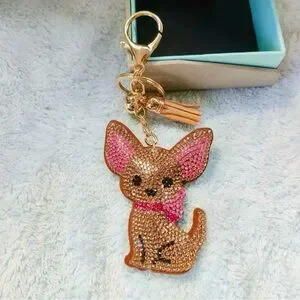 Chihuahua Dog Pink & Brown Rhinestone-Encrusted Key Chain, Bag, & Car Charm