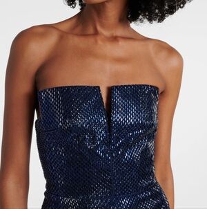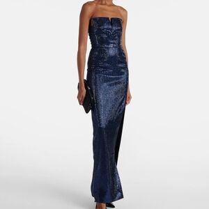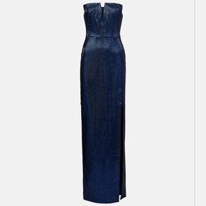 This strapless gown from Roland Mouret is a shiny go-to for memorable events. Made from crêpe, its design is shaped with a sheath silhouette, and the embellished front features a deep side slit.