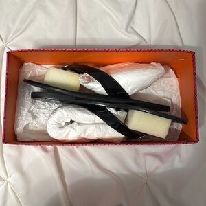 Stylish black flip flops with Tory Burch logo. Perfect for casual wear.