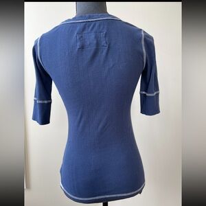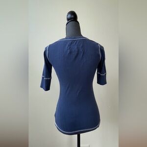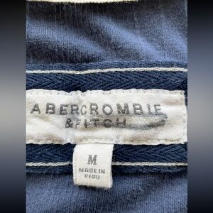 Description: 2000’s era Abercrombie & Fitch. 3/4 sleeves. Round neck with button design. Ribbed material. Blue with embroidered logo on left side and contrast stitching on hem.