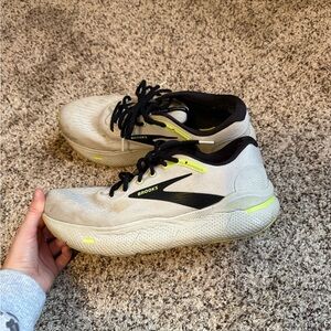 These Brooks sneakers showcase a sleek white design accented by bold black details, including the laces and logo. With a traditional lace-up and low-top style, they offer a perfect blend of comfort and modern athletic aesthetics. Ideal for those who value both style and performance in their footwear.
