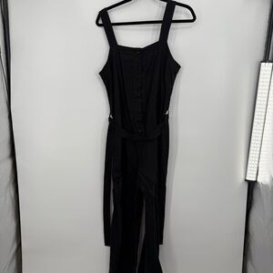 Chic black sleeveless jumpsuit with button front and belt. Perfect for any occasion.